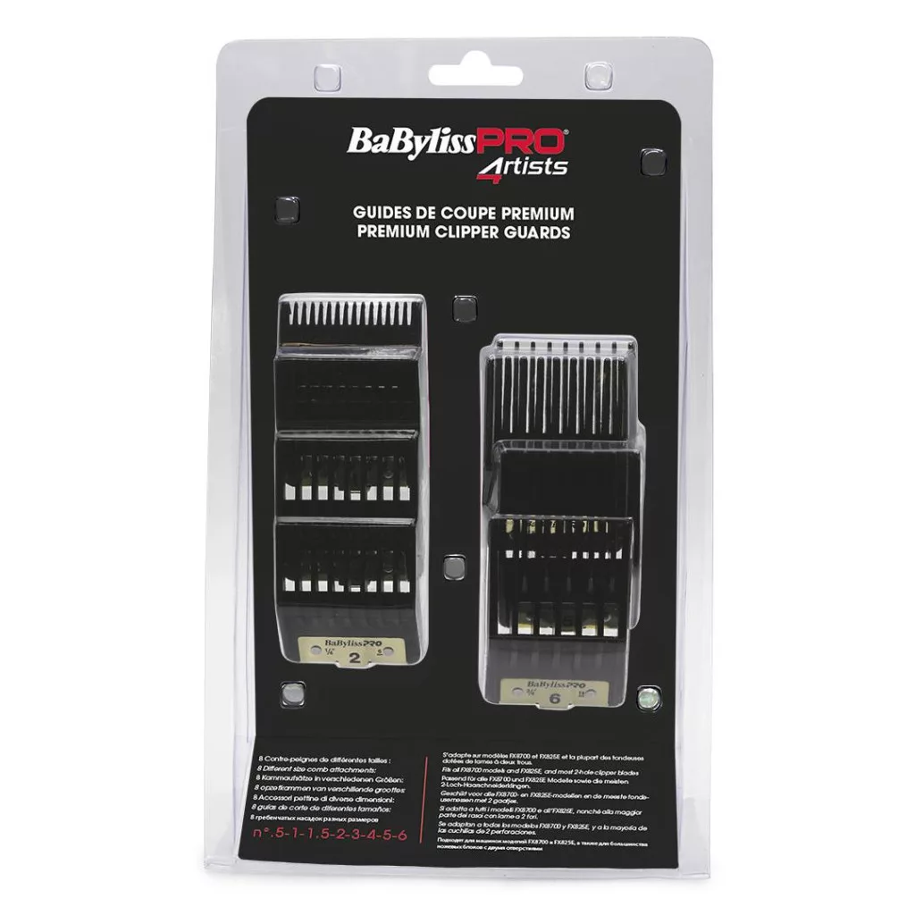 A 8 darabos prémium minőségű vágásirányító készlet nélkülözhetetlen kiegészítő a BaByliss PRO hajnyíróihoz (BPFX8700E, BPFX8700IBPE, BPFX8700GE, BPFX8700RBPE, BPFX8700RGPBE). A tartós, üvegszállal erősített kialakítás hosszú élettartamot és megbízható használatot biztosít a mindennapi szalonszintű igénybevétel során.