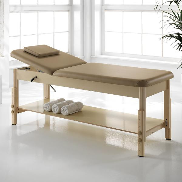 Ez a prémium Feng Shui masszázságy elegáns bézs színben, rendkívül masszív fa vázzal biztosítja a maximális stabilitást. A kényelmet az egyénileg állítható lábak és a többféle pozícióba rögzíthető állítható háttámla garantálja. A praktikus kialakítás jegyében a fekvőfelület alatt egy tágas tárolópolc található, így a legfontosabb masszázs eszközök mindig kéznél lesznek a kezelés során.