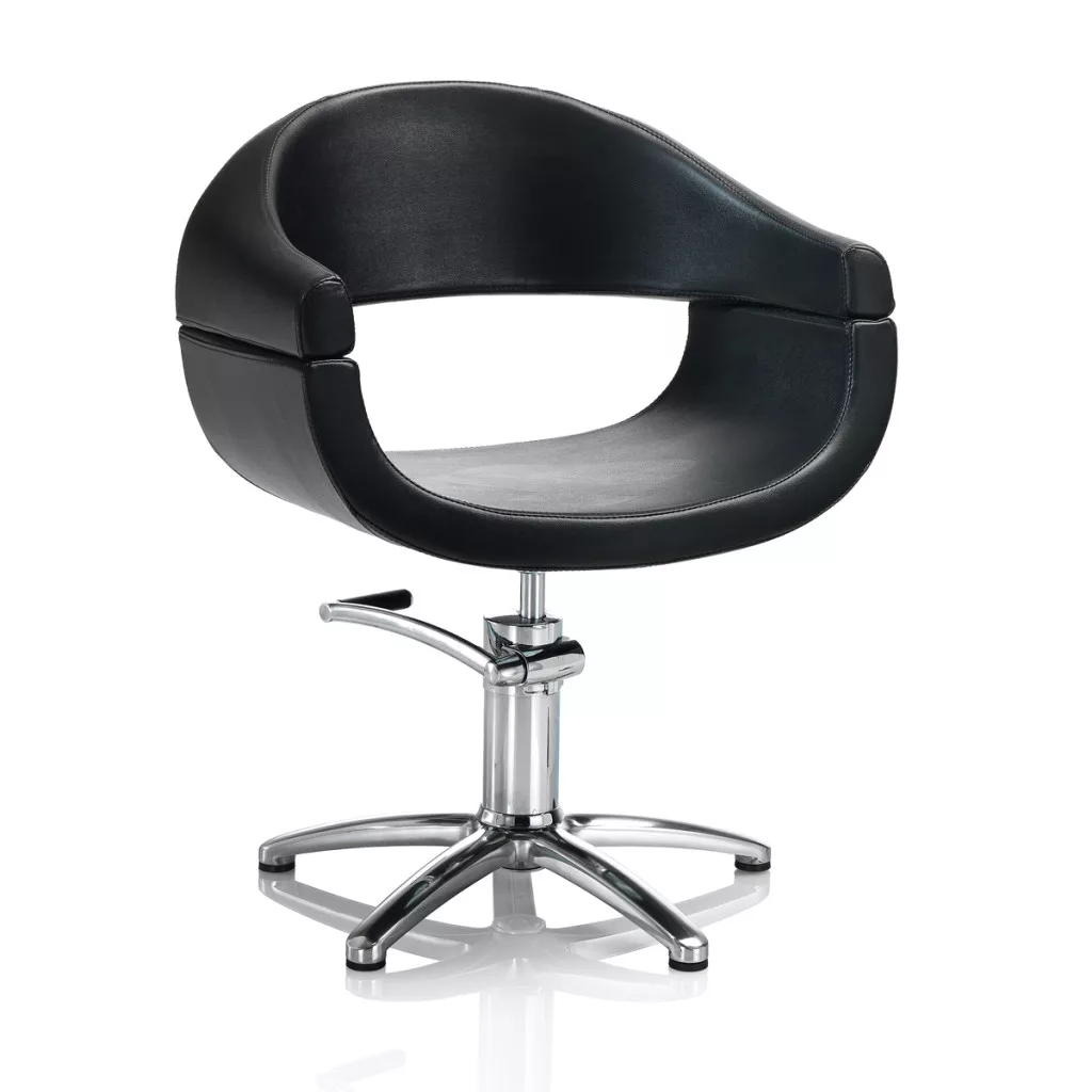 Elegáns fodrász szék, könnyen tisztítható, fekete műbőrrel kárpitozott, krómozott alumínium forgó talppal, hidraulikus pumpával és fékkel. A letisztult stílusa könnyedén illeszkedik egy modern fodrász szalonba.