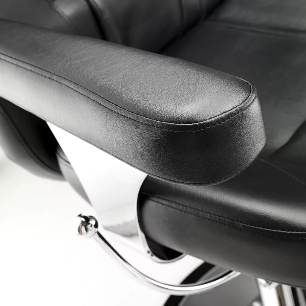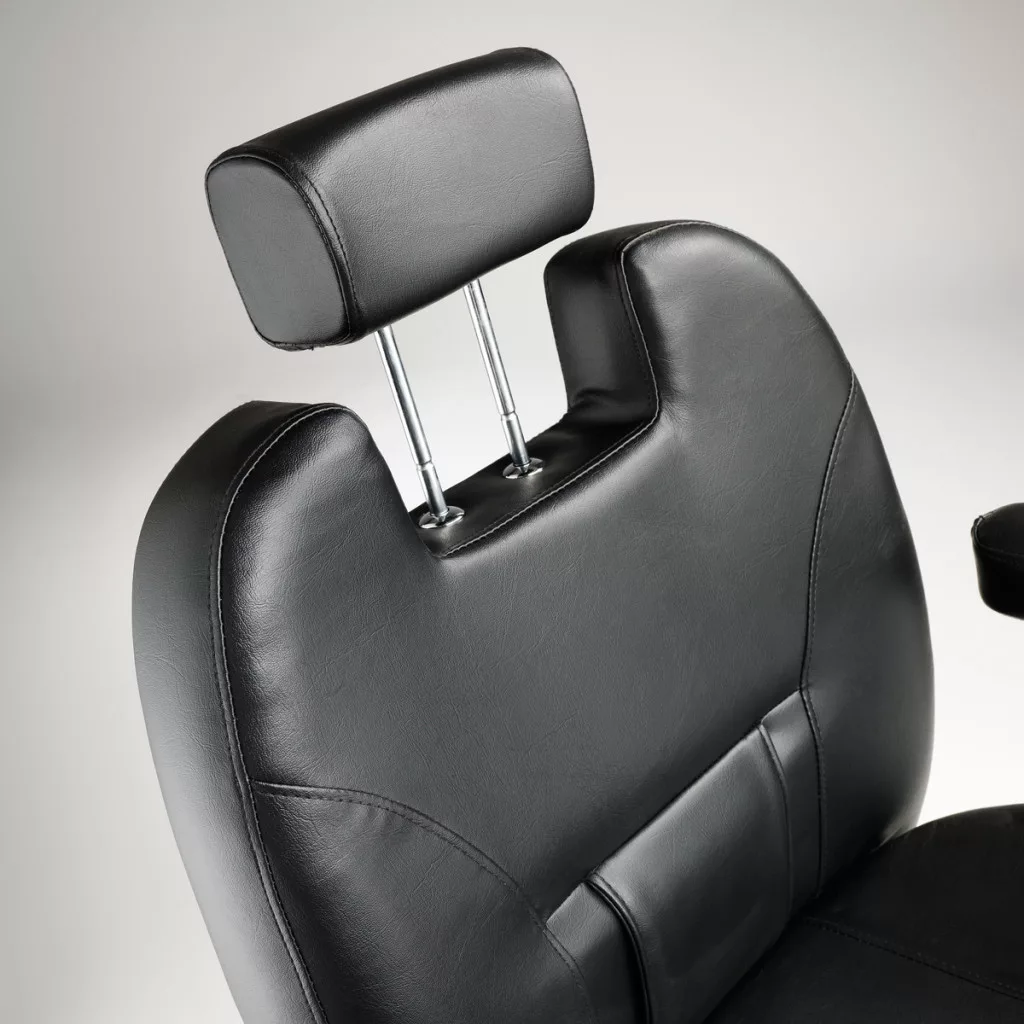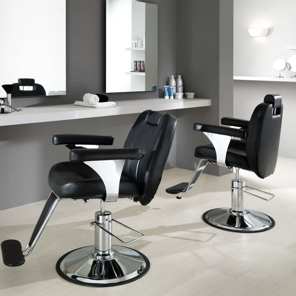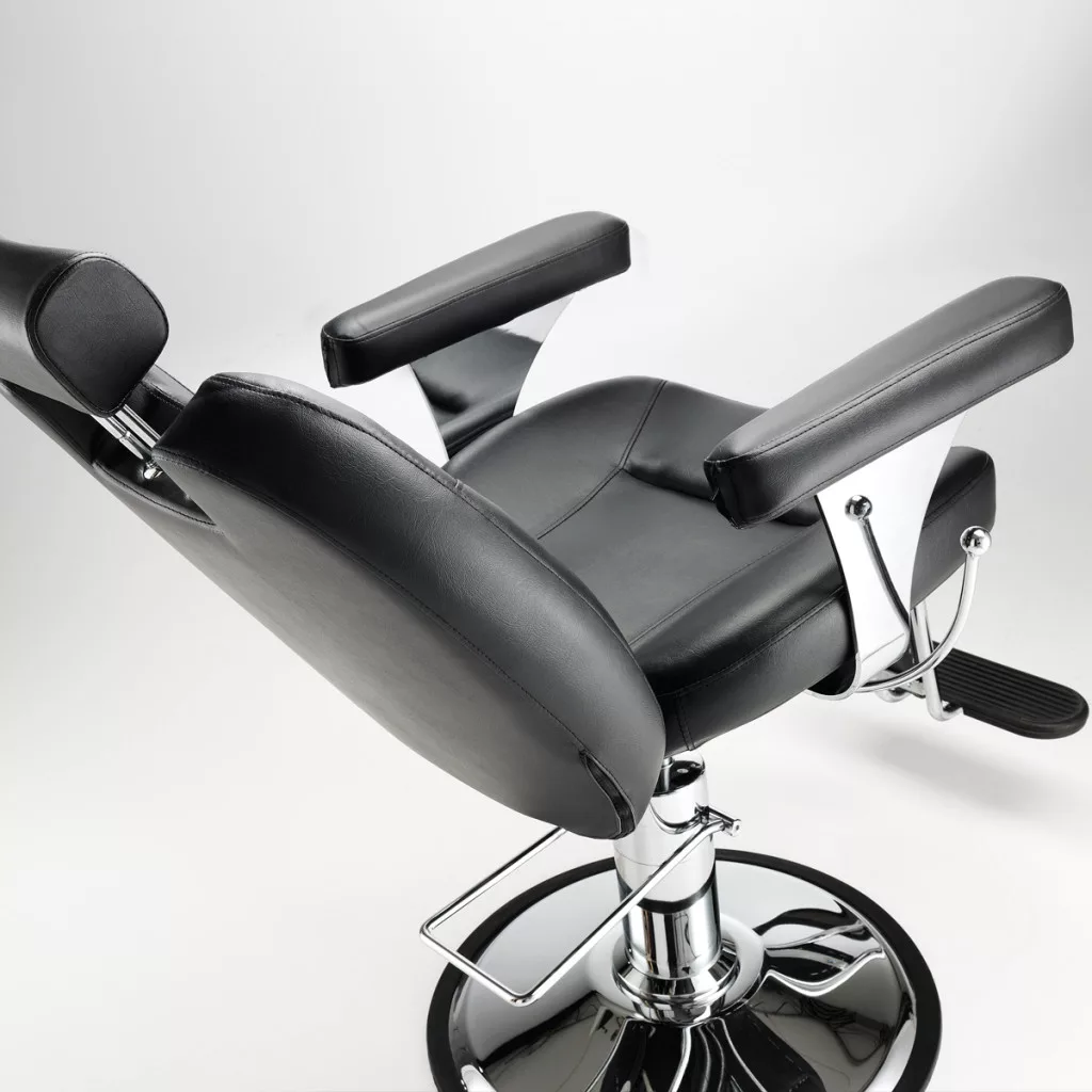 A kényelmes Siviglia fodrász szék krómozott vázzal, fekete műbőr kárpittal, kör alakú gumírozott talppal, hidraulikus pumpával és állítható fejtámlával rendelkezik. Könnyen tisztítható, vízálló.