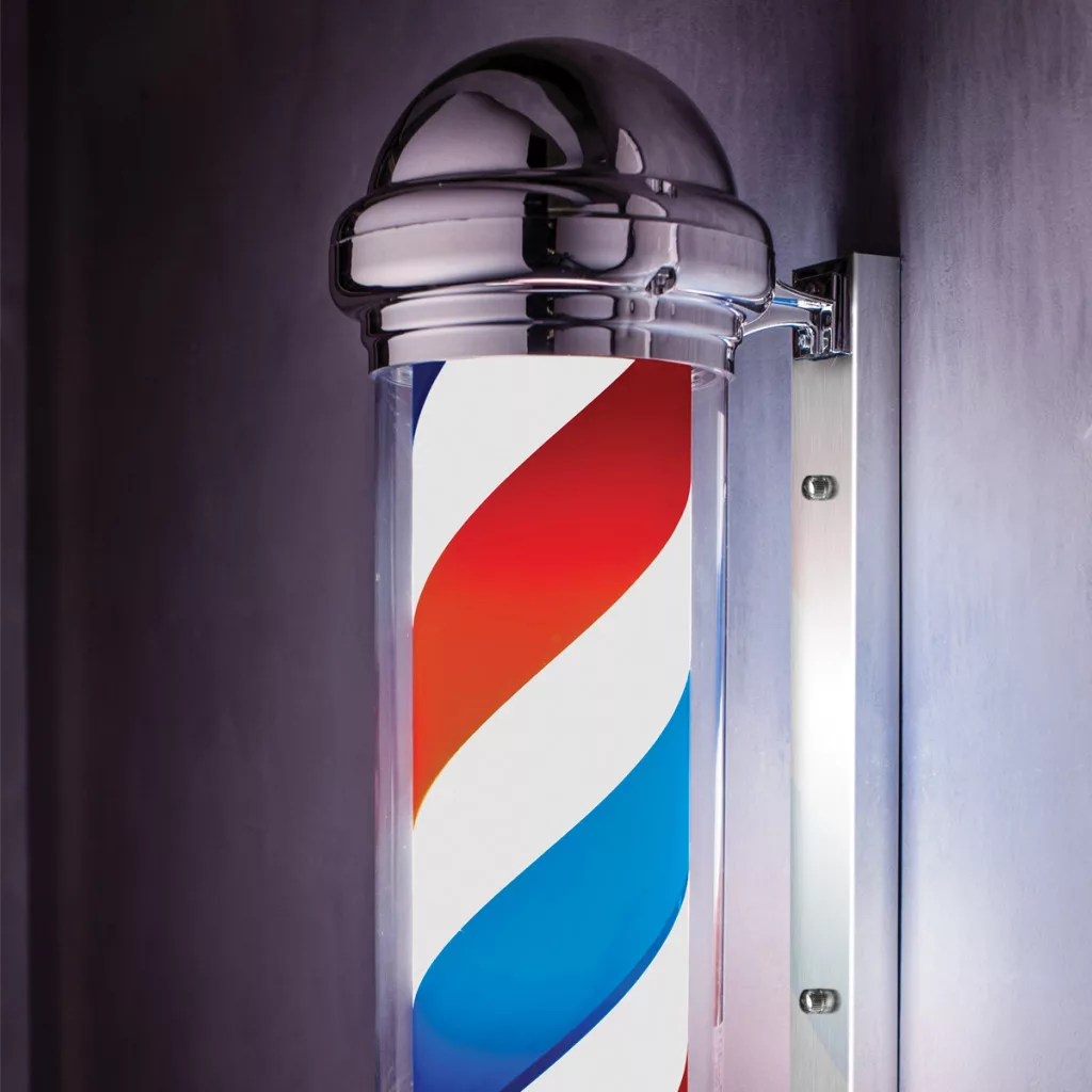 A klasszikus borbély cégér, egy nemzetközi szimbólum, amelyet világszerte a barber szalonok azonosítására használnak. A cégér motorja a hagyományos piros, kék és fehér csíkokat forgatja, ez szimbólum és ikon a vállalkozásod számára, ami ráadásul egy kis vintage beütéssel is rendelkezik. A fém tartó konzol lehetővé teszi, hogy a cégért a szalonon belül vagy kívül helyezd el.
