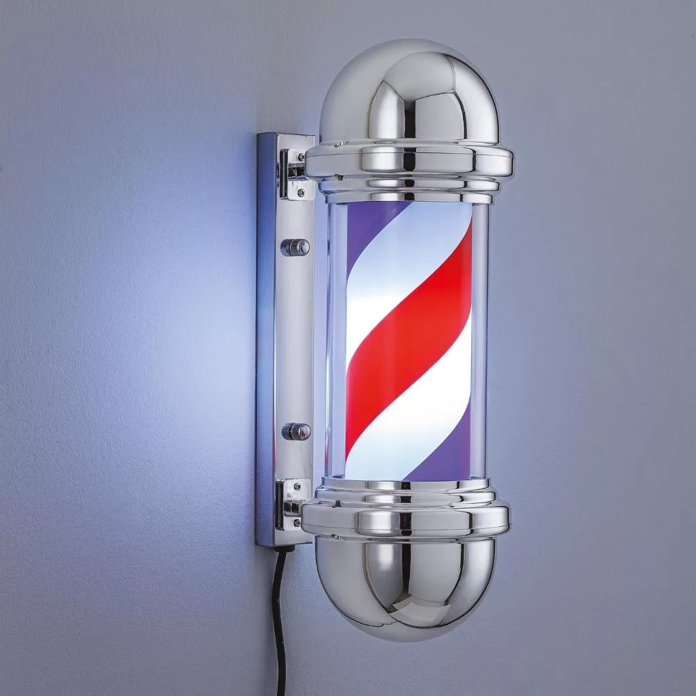 A klasszikus borbély cégér, egy nemzetközi szimbólum, amelyet világszerte a barber szalonok azonosítására használnak. A cégér motorja a hagyományos piros, kék és fehér csíkokat forgatja, ez szimbólum és ikon a vállalkozásod számára, ami ráadásul egy kis vintage beütéssel is rendelkezik. A fém tartó konzol lehetővé teszi, hogy a cégért a szalonon belül vagy kívül helyezd el.