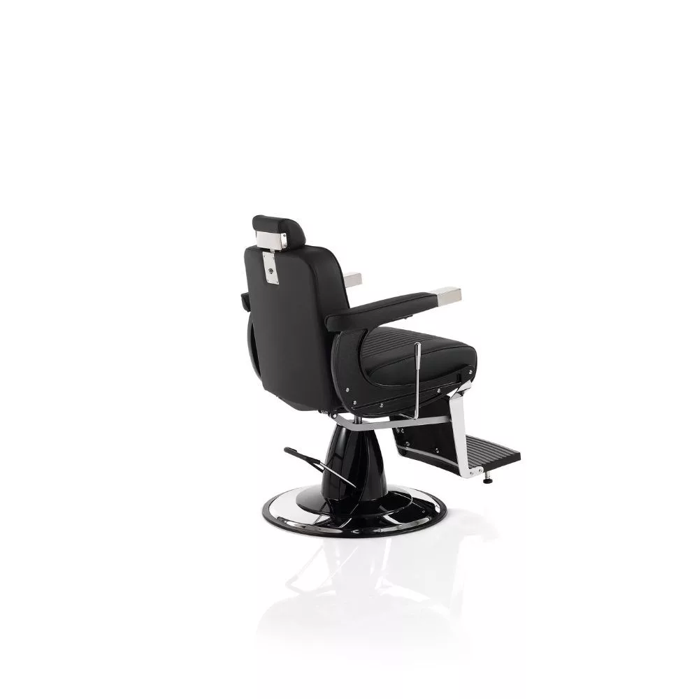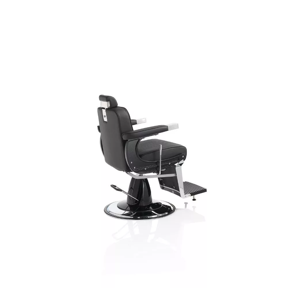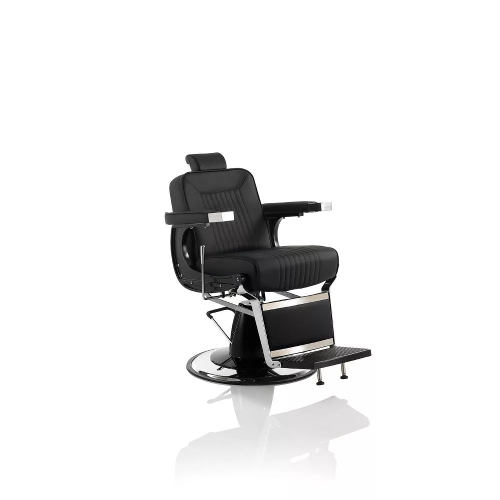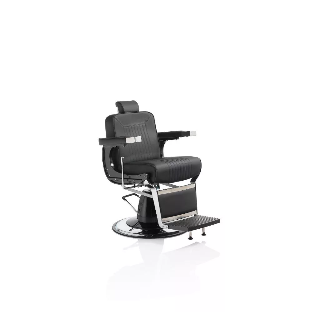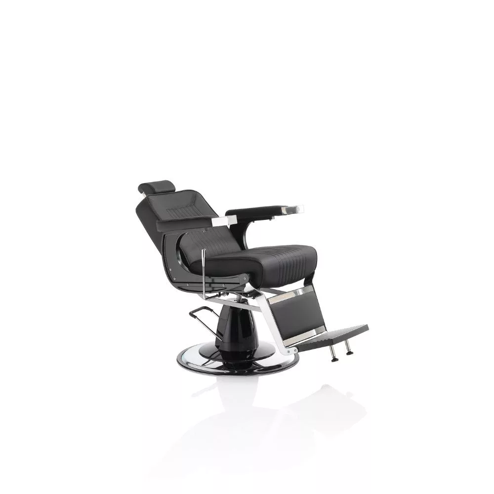 A Hair Corsaro elegáns és nagyszerű barber szék, dönthető háttámlával, lábtartóval és állítható fejtámlával, fekete öko bör kárpitozással áll rendelkezésre.