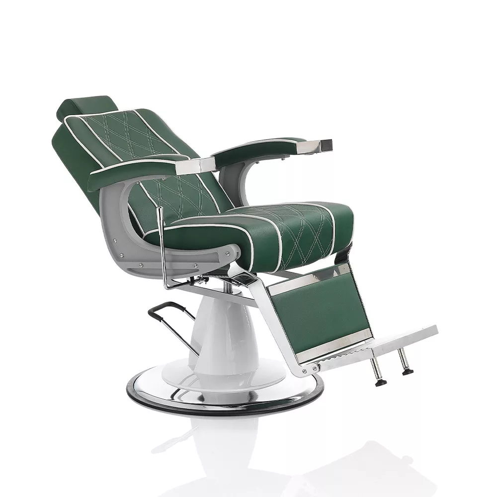 A Hair Granada elegáns és nagyszerű barber szék, dönthető és állítható háttámlával, kárpitozott lábtartóval és állítható fejtámlával, zöld öko műbőr borítással áll rendelkezésre. Zöld/fehér színével retro hangulatot idéz a barber szalonodba.