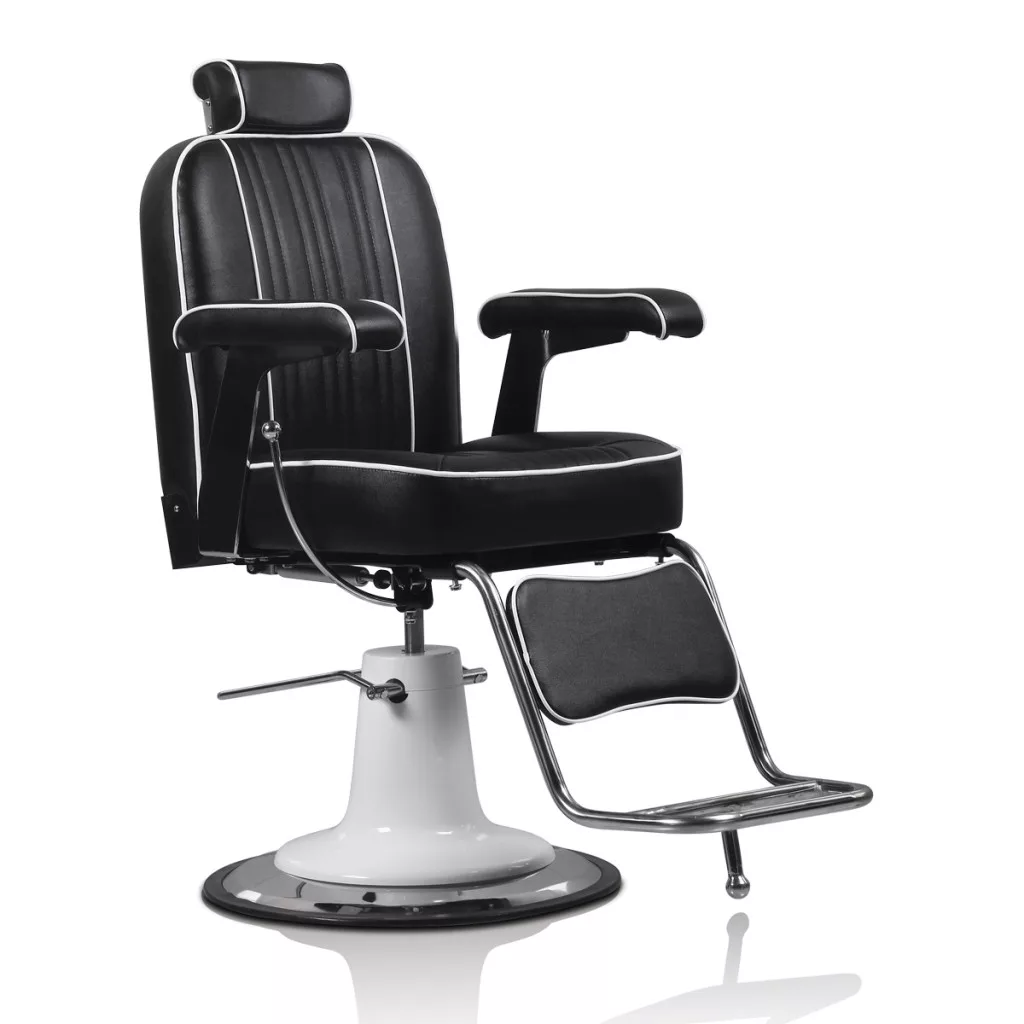 A Hair Malaga elegáns és nagyszerű barber szék, dönthető háttámlával, kárpitozott lábtartóval és állítható fejtámlával, fekete/fehér műbör borítással áll rendelkezésre. Fekete/fehér színével retro hangulatot idéz a barber szalonodba.