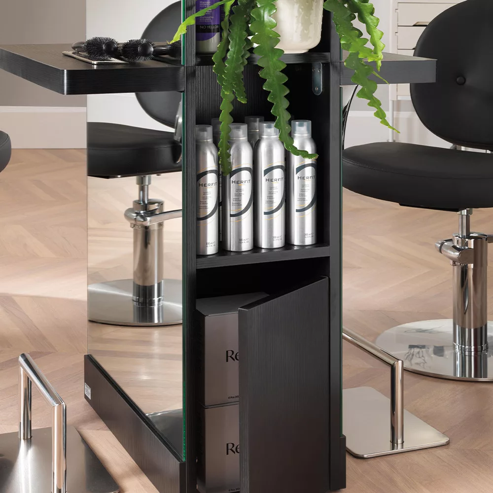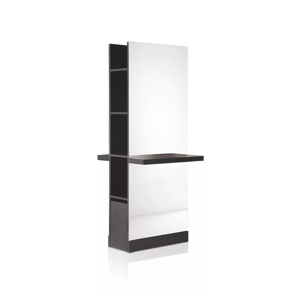 Luce Dou tükrös munkafal. Masszív, egyszerű, letisztult dizájnjával a fodrász szalonod éke lesz. Oldalsó részében polcokkal, ami rendezett, letisztult szalon képét eredményez. A fekete, fa szerkezet exkluzívvá varázsolja a miliőt!
