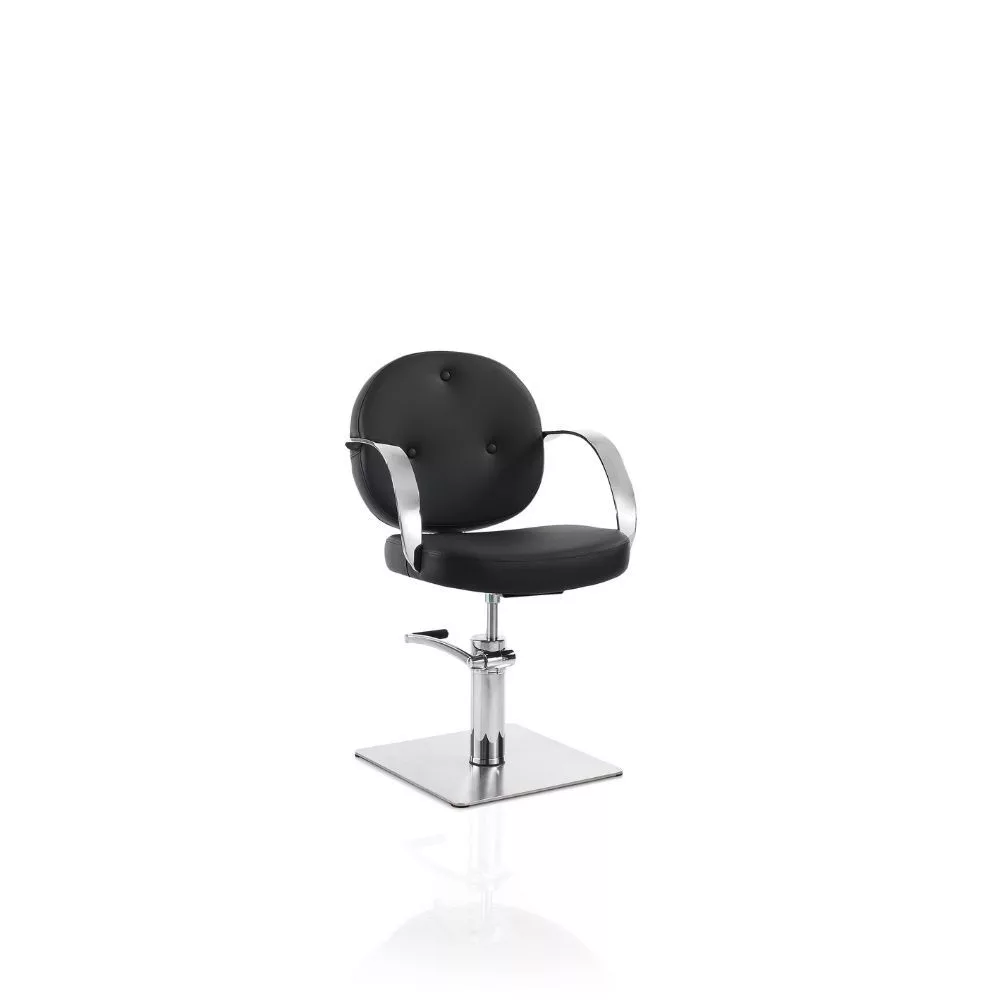 Elegáns és modern, könnyen tisztítható, fekete ökobőrrel kárpitozott fodrász szék, krómozott forgó talppal, hidraulikus pumpával és fékkel.