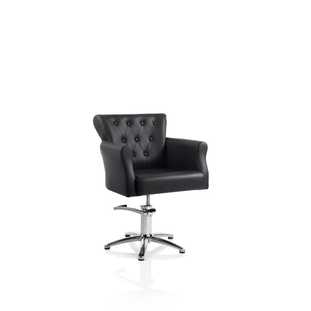 Elegáns és modern, könnyen tisztítható, fekete ökobőrrel kárpitozott fodrász szék, krómozott forgó talppal, hidraulikus pumpával és fékkel.