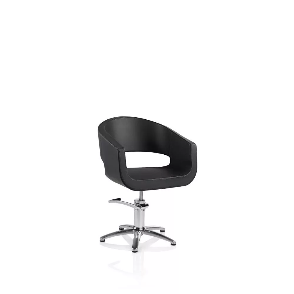 Elegáns és modern, könnyen tisztítható, fekete ökob-bőrrel kárpitozott fodrász szék, krómozott forgó talppal, hidraulikus pumpával és fékkel.