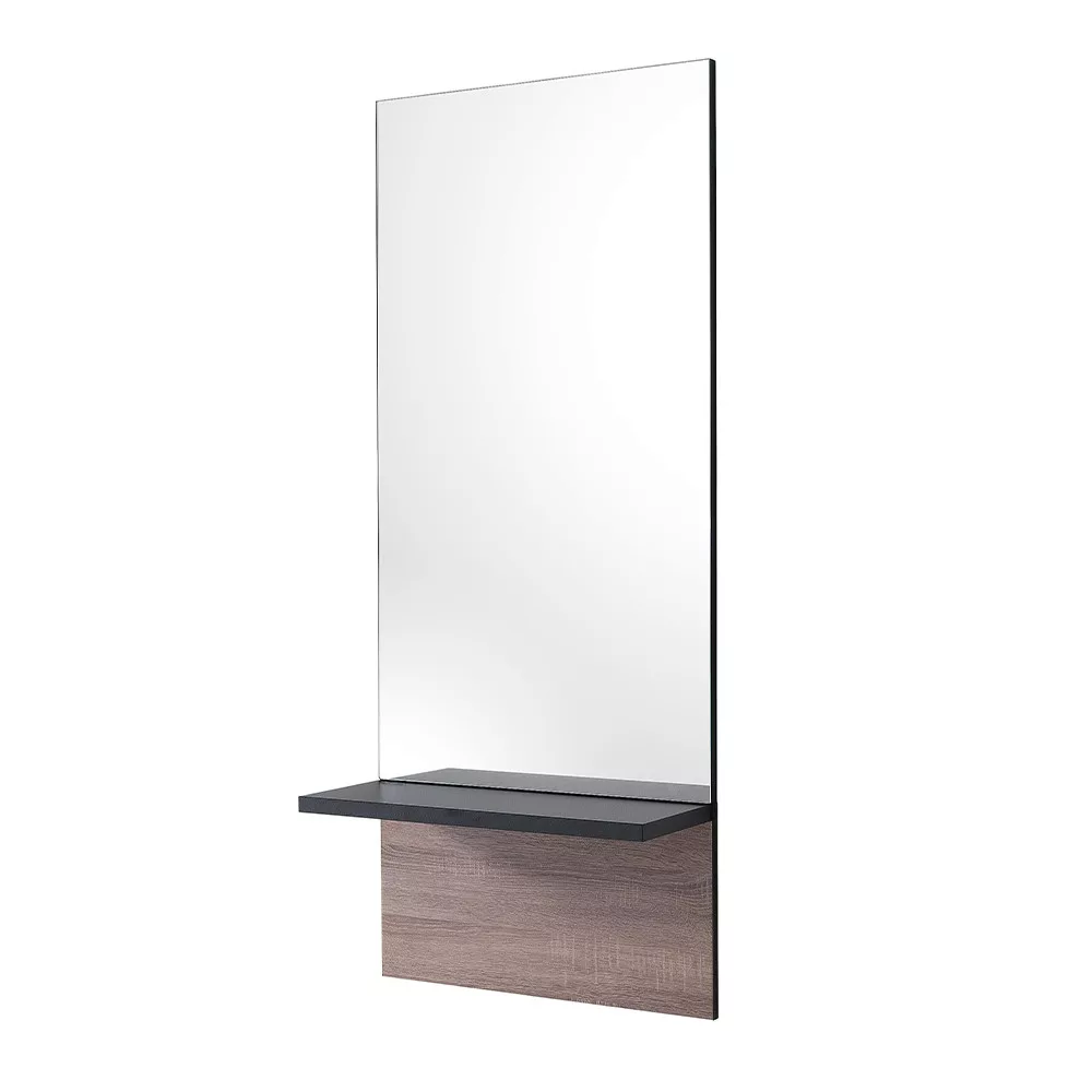 Tükrös egység/munkafal polccal. Masszív, egyszerű, letisztult dizájnjával a fodrász szalonod éke lesz. A fekete fa polc praktikussá teszi!