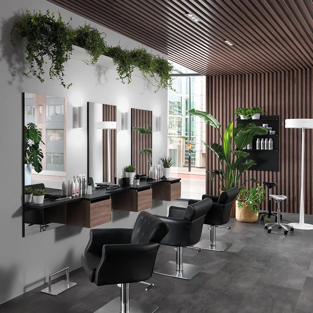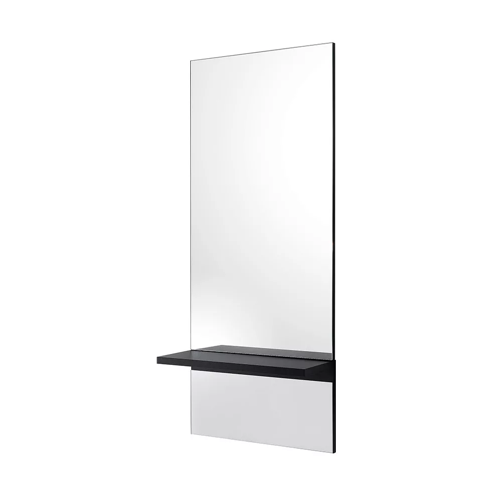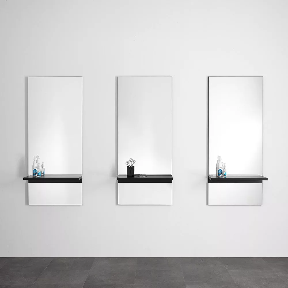 Tükrös egység/munkafal polccal. Masszív, egyszerű, letisztult dizájnjával a fodrász szalonod éke lesz. A fekete fa polc praktikussá teszi!