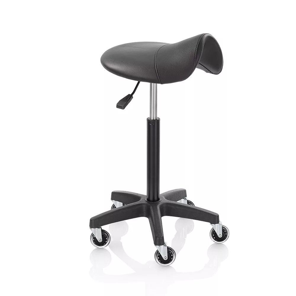 Roller Pro Ideal Comfort L nyeregzsámolyzsámoly fekete műbőr kárpittal, fekete csillag talppal. Ez a forgózsámoly tökéletesen kiegészíti a szalon berendezését, vágáskor is használható, vagy csak a recepciós pultnál ülve; a szék kiválóan segíti a professzionális munkát a fodrászszalonokban és a szépségközpontokban egyaránt. Elegáns, ergonomikus és tartós – ideális választás forgalmas szalonokba.