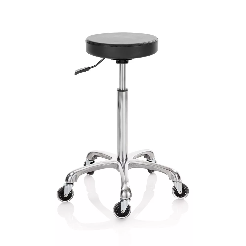 Roller Pro Elité L forgózsámoly fekete műbőr kárpittal, króm csillag talppal. Ez a forgózsámoly tökéletesen kiegészíti a szalon berendezését, vágáskor is használható, vagy csak a recepciós pultnál ülve; a szék kiválóan segíti a professzionális munkát a fodrászszalonokban és a szépségközpontokban egyaránt. Elegáns, ergonomikus és tartós – ideális választás forgalmas szalonokba.
