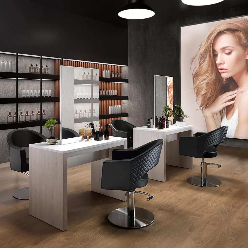 Consolle dupla tükrös munkaállomás. Masszív, egyszerű, letisztult dizájnjával a fodrász szalonod éke lesz. Helytakarékos, ajánljuk kisebb szalonokba, ahol többen tudnak dolgozni egyszerre. A fa hatású laminált asztalrész exkluzívvá varázsolja a miliőt!