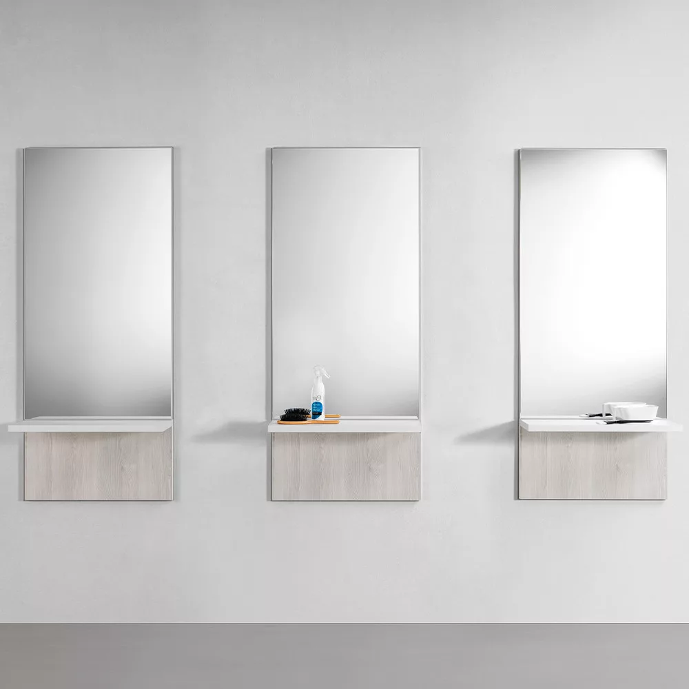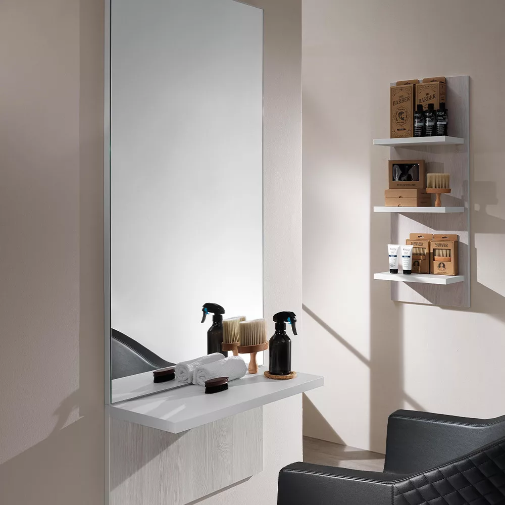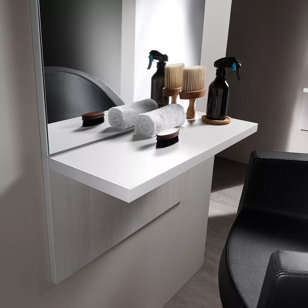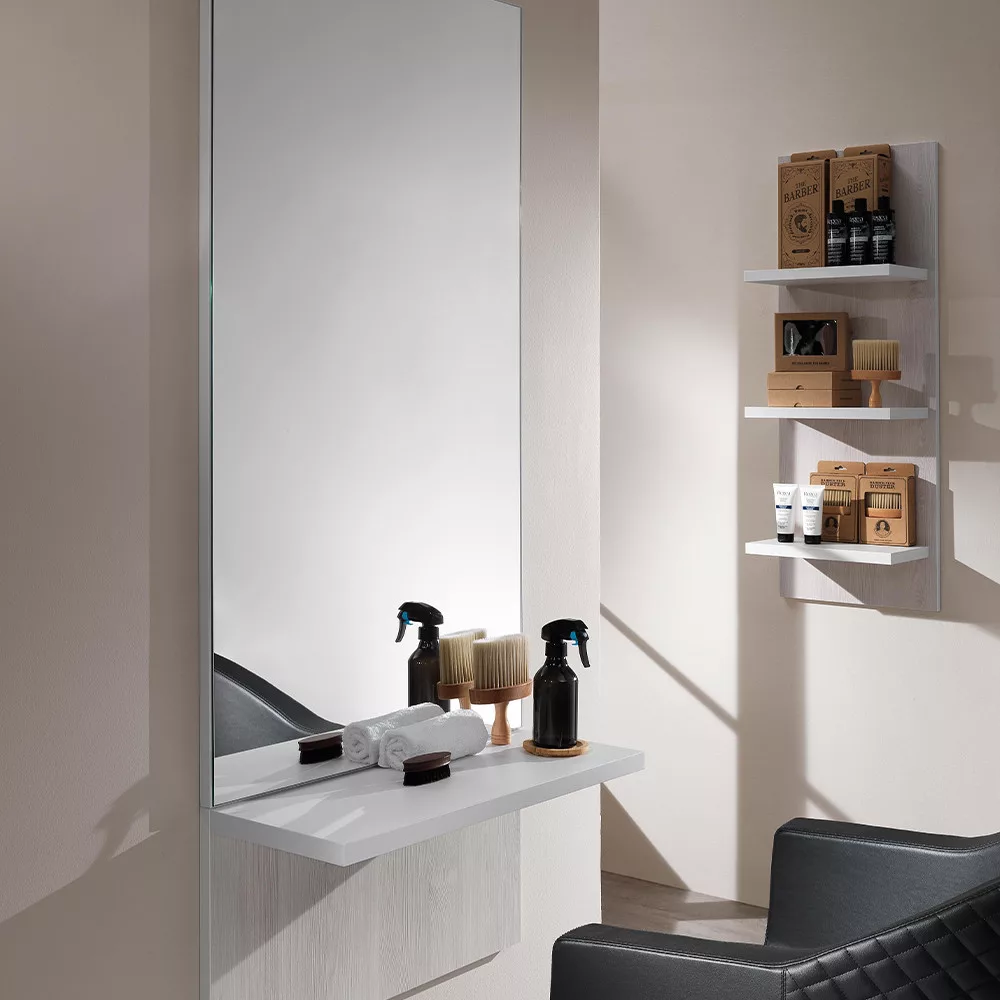 Tükrös egység/munkafal polccal. Masszív, egyszerű, letisztult dizájnjával a fodrász szalonod éke lesz. A fekete fa polc praktikussá teszi!