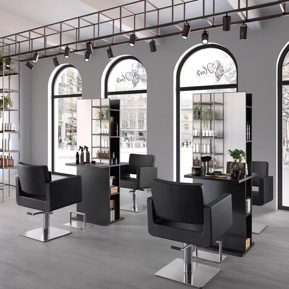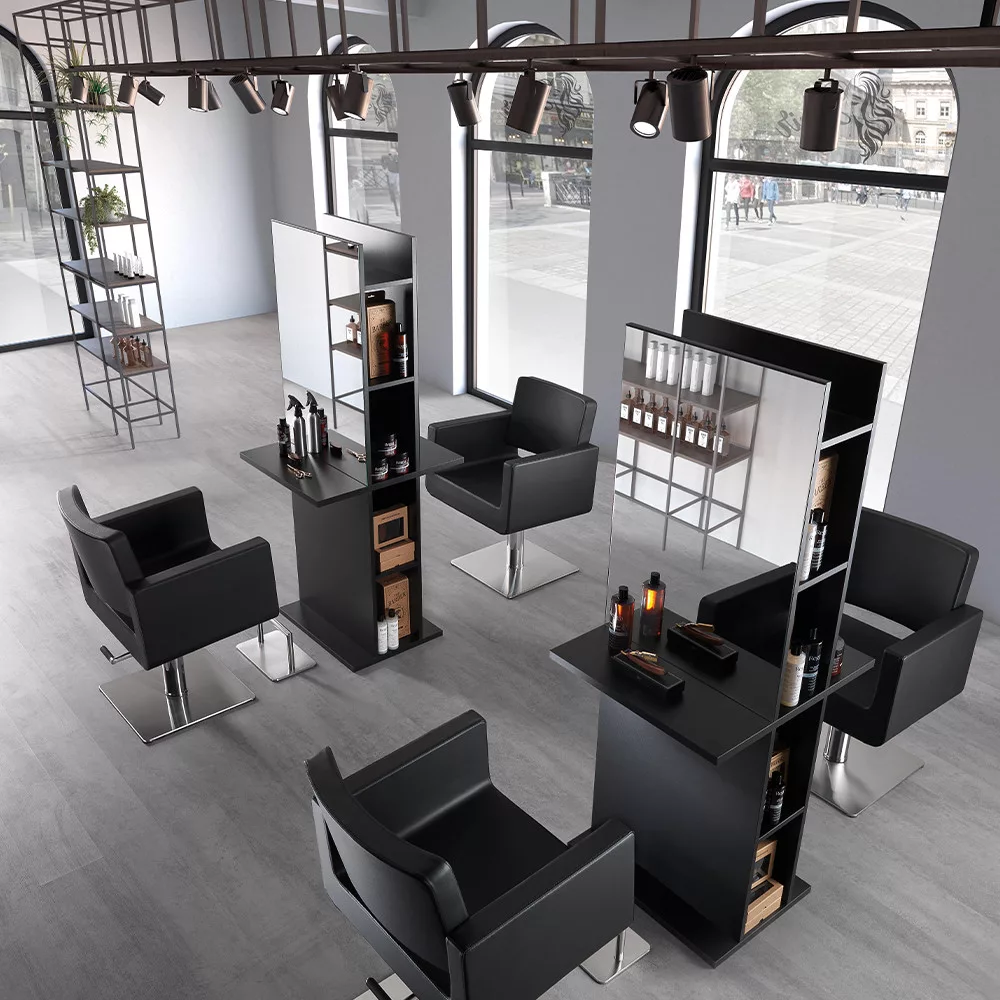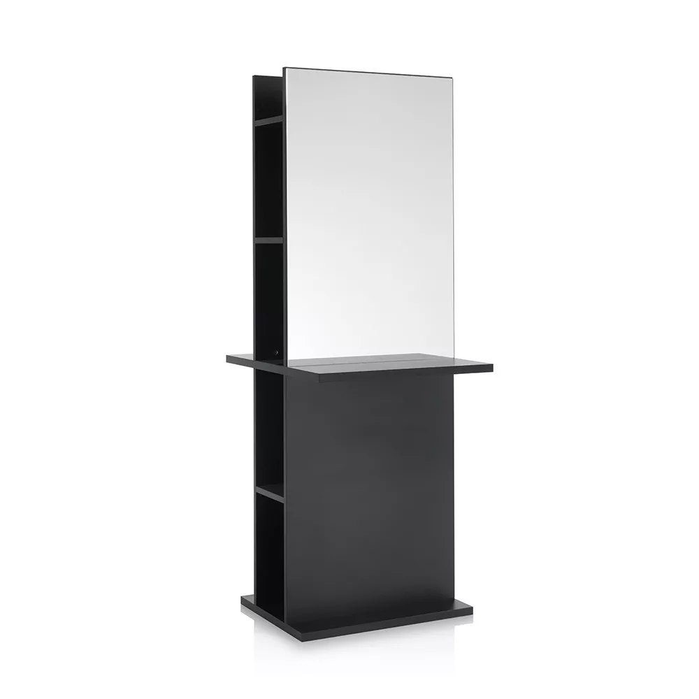 Totem tükrös munkafal. Masszív, egyszerű, letisztult dizájnjával a fodrász szalonod éke lesz. Oldalsó részében polcokkal, ami rendezett, letisztult szalon képét eredményez. A fekete, fa szerkezet exkluzívvá varázsolja a miliőt!