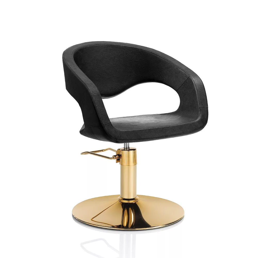 Hair Wave fodrász szék, elegáns és modern, könnyen tisztítható, fekete műbőrrel kárpitozott fodrász szék, arany forgó talppal, hidraulikus pumpával és fékkel.