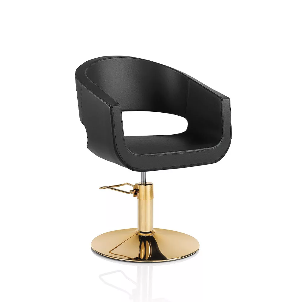 Elegáns és modern, könnyen tisztítható, fekete ökobőrrel kárpitozott fodrász szék, arany krómozott forgó talppal, hidraulikus pumpával és fékkel.