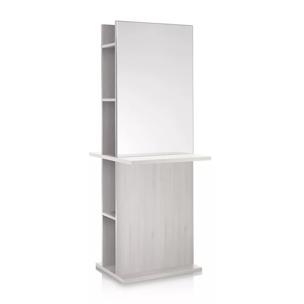 Totem tükrös munkafal. Masszív, egyszerű, letisztult dizájnjával a fodrász szalonod éke lesz. Oldalsó részében polcokkal, ami rendezett, letisztult szalon képét eredményez. A fehér vörösfenyő, fa szerkezet exkluzívvá varázsolja a miliőt!