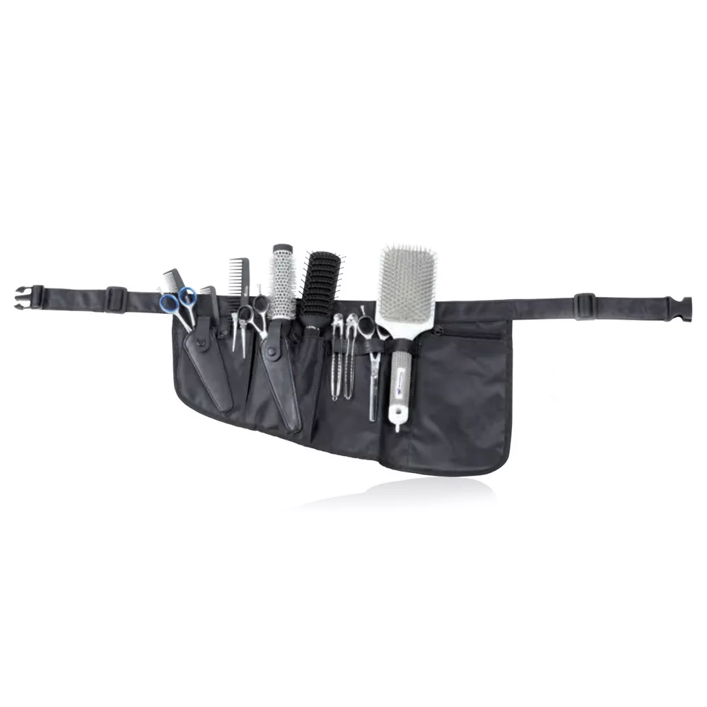 Eszköztartó övtáska, fekete színben. Könnyen tisztítható. A különböző méretű rekeszekbe különböző típusú eszközök és alaptartozékok helyezhetők, például ollók, fésűk vagy csatok egyaránt, hogy mindig kéznél legyenek. Kényelmes derék vagy vállszíjjal.
